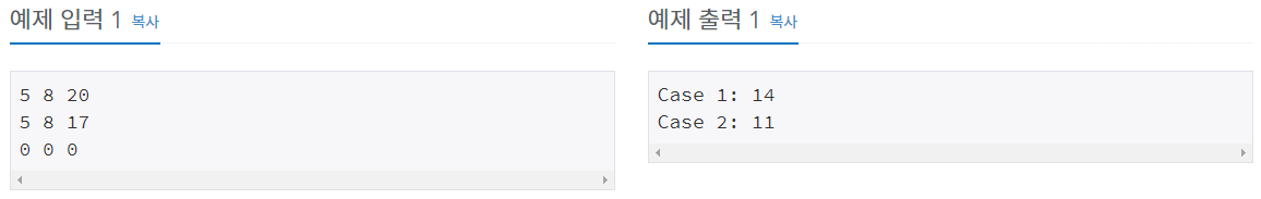 모든 입력 정수는 int범위이다. 마지막 줄에는 0이 3개 주어진다.