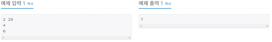 첫 줄에 폭죽을 터뜨리는 학생의 수 N(1 ≤ N ≤ 100)과 폭죽쇼가 끝나는 시간 C(1 ≤ C ≤ 2,000,000)가 주어진다. 그 다음 N개의 줄에는 학생들이 폭죽을 터뜨리는 주기가 한 줄에 하나씩 주어진다. 주�