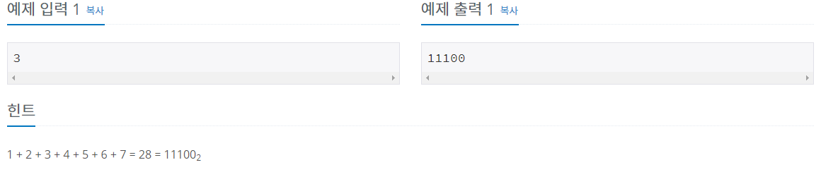 첫째 줄에 이진수로 나타냈을 때, k자리 이하인 모든 자연수의 합을 이진수로 출력한다.