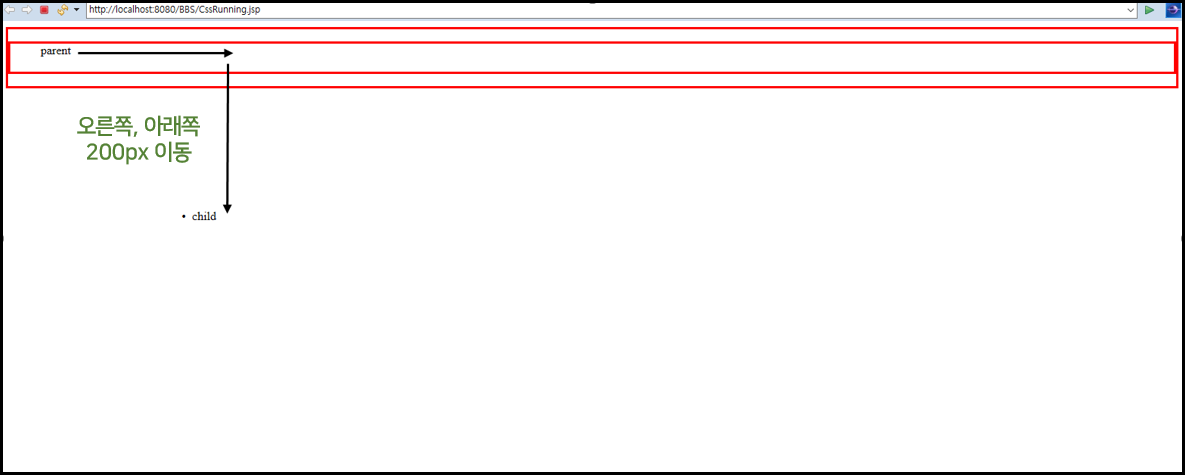 child의 제일 첫 번째 부모인 parent에게 position:relative 값을 주어서 child 위치 기준점이 <html>이 아니게 해 보았다.