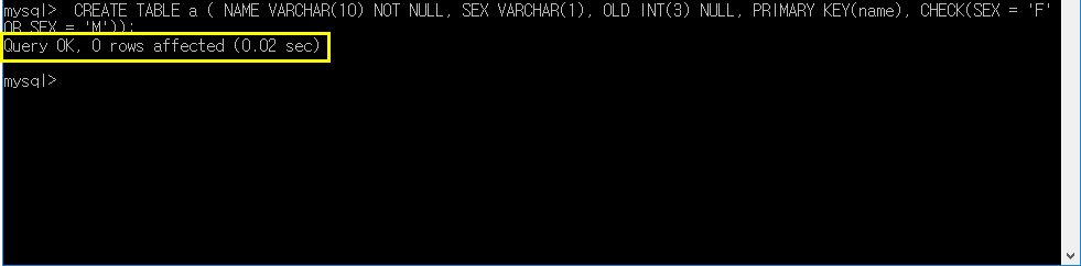 해당 CREATE문이 정상적으로 작동되며, 아래와 같은 문구가 뜬다. "Query OK, 0 rows affected (0.02 sec)"