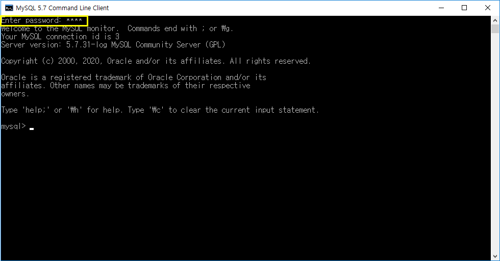 해당 프로그램을 실행해보면 위와같이 cmd 화면과 같은 창이 뜰 텐데, 자신이 노란색으로 표시된 사각형처럼 정해둔 password를 입력하면, "Welcome to the MySQL monitor. Commands end with ; or \g. " 문구가 뜨며, 이는 정상적으로 프로그램 실행이 된 것이다.