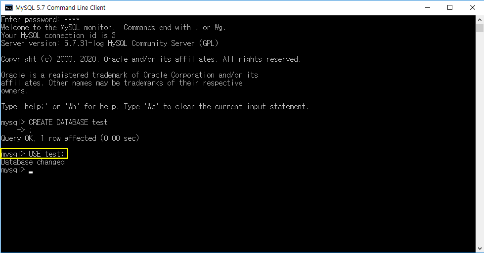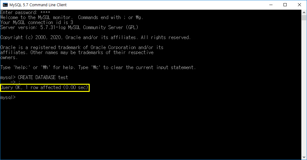 정상적으로 DATABASE가 만들어 지면 노란색 사각형처럼 "Query OK, 1 row affected (0.00 sec)" 문구가 뜰 것이다.