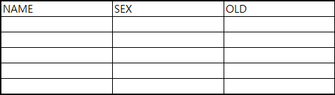 우선 위와 같은 예제로 진행을 하도록 하겠다. 속성은 NAME / SEX / OLD 총 세 가지로 하여 데이터를 입력받을 수 있도록 TABLE을 만들어 보도록 하겠다. 우선 아래가 그 코드이며, 설명은 주석으로 달아두었다.