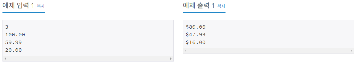 각 줄에는 물건의 원래가격이 소수점 둘째자리까지 주어진다.