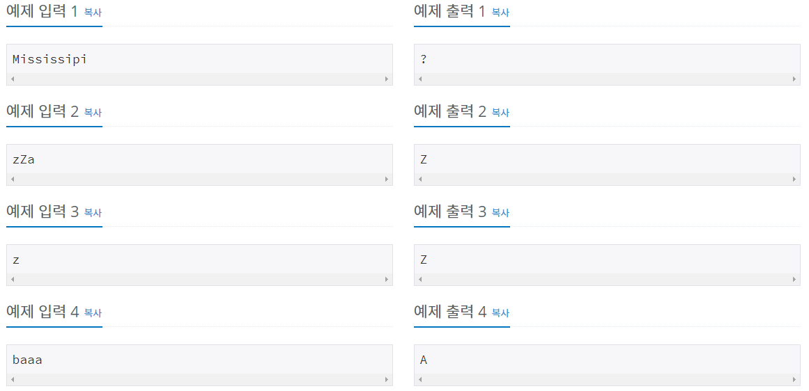 첫째 줄에 이 단어에서 가장 많이 사용된 알파벳을 대문자로 출력한다. 단, 가장 많이 사용된 알파벳이 여러 개 존재하는 경우에는 ?를 출력한다.