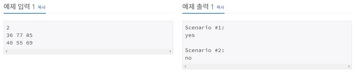 각 테스트 케이스마다 "Scenario #i:"를 출력한다. i는 테스트 케이스 번호이며, 1부터 시작한다. 그 다음 줄에는 입력으로 주어진 삼각형이 직각 삼각형인 경우에는 "yes", 아닌 경우에는 "no"를 출력