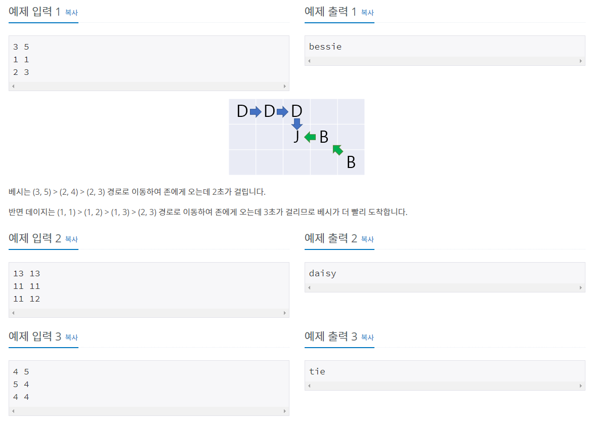 첫 번째 줄에 베시가 더 빨리 도착하면 'bessie', 데이지가 더 빨리 도착하면 'daisy', 동시에 도착하면 'tie' 를 출력합니다.
