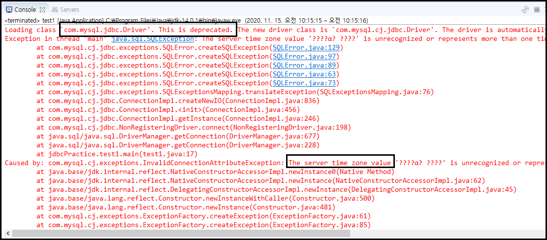 이와 같은 오류는 mysql의 버전이 업데이트에 따른 기존에 url과 Class.forName()으로 가져오는 class의 문제이다.