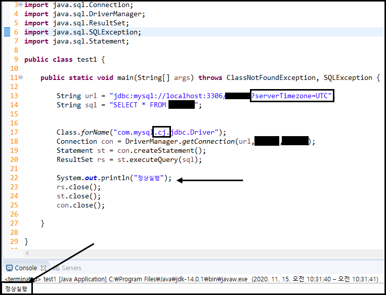 이와 같은 내용에서 화살표로 표시한 url과 Class.forName()의 내용을 조금만 수정해주면 된다.