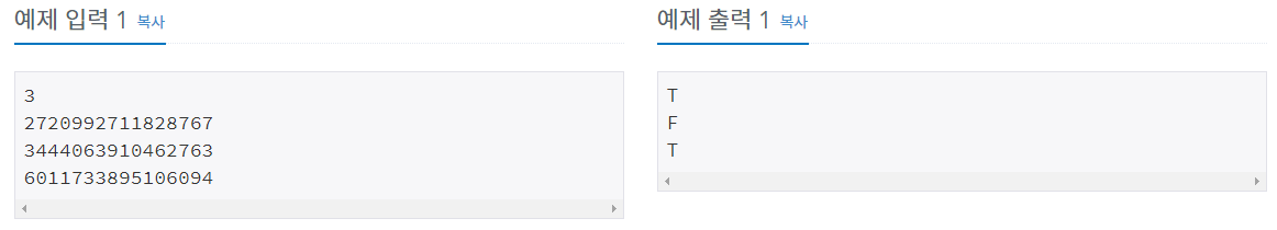 신용카드의 번호가 유효하면 “T”, 유효하지 않으면 “F”를 한 줄 씩 출력한다.