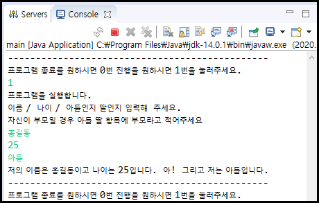 System.out.println("프로그램 종료를 원하시면 0번 진행을 원하시면 1번을 눌러주세요.");