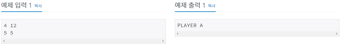 플레이어 A의 카드가 남아있다면 "PLAYER A"를, 플레이어 B의 카드가 남아있다면 "PLAYER B"를 출력한다.