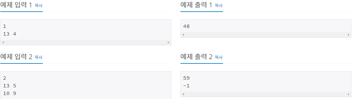 각 테스트 케이스에 대해, 한 줄에 하나씩 L열의 네 번째 자리의 좌석 번호를 출력한다. 만약 영화관에 L열 네 번째 자리가 존재하지 않는다면 -1을 출력한다.