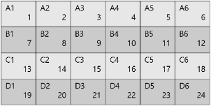 좌석의 번호는 좌상단 끝에 있는 A열의 첫 번째 자리부터 1번으로 시작하여 오른쪽으로 번호가 하나씩 증가하다가 끝에 다다르면 B열의 첫 번째 자리부터 또 오른쪽으로, C열의 첫 번째 자리부터 또 오른쪽으로 진행하는 것을 반복하면서 숫자가 증가해 나간다. 정휘가 좌석 L4를 빠르게 선점하여 Show Yourself를 신나게 부를 수 있도록 L열의 네 번째 자리의 좌석 번호를 구해주자.