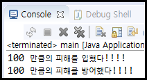 인터페이스 선언시 타입은 Integer 값을 주고 매개 값으로 공격 방어 모두 100의 정수 값을 주었다. 이후 컴파일 진행 시에도 오류 없이 아래와 같이 출력되는 것을 확인할 수 있다.