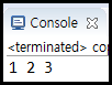 매개변수로는 [ Arrays.copyOfRange(복사하고자하는 배열, 시작 위치, 배열크기); ]로 선언해주면 되며, 주의할 점은 복사되는 배열은 시작 위치부터 배열크기 바로 전까지 복사된다는 점이다. 위의 코드처럼 배열을 복사해주면 실제 복사되는 배열 arr3 에는 정수 1, 2, 3 이 복사된다. 즉 arr1의 0 ~ 2 인덱스의 값이 저장된다. 출력하게 되면 아래와 같이 1, 2, 3 정수가 정상적으로 복사된 것을 확인할 수 있다.