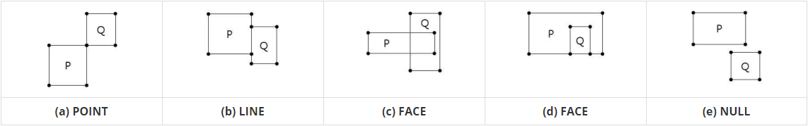 2차원 좌표 평면 위에 두 개의 박스(직사각형) P, Q가 놓여 있다. 각 박스의 변은 x축이나 y축에 평행하다. 박스를 연구하는 학수는 이 두 박스의 교차 상태를 파악하여 내부가 겹쳐 있는지 (FACE), 그렇지 않고 선분에서 만나는 지(LINE), 그렇지 않고 한 점에서 만나는지(POINT), 아예 만나지 않는지 (NULL) 구별하려고 한다.