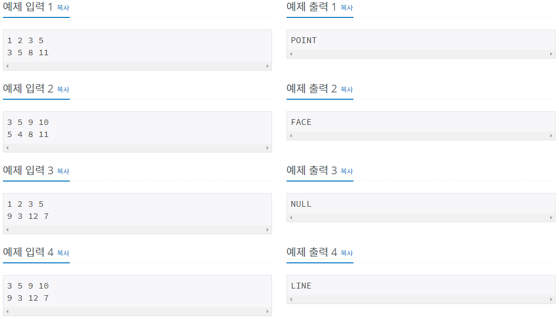 표준 출력으로 두 박스의 교차 상태를 POINT, LINE, FACE, NULL 중의 하나로 출력한다. 두 박스의 교차 상태는 모두 대문자로 출력한다.