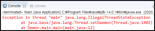 이제 메인클래스로 가서 실행을 해보도록 하자. 사전에 두클래스 모두 스레드 변수로 선언해 주었으며, 데몬스레드로 사용할 thread1의 경우는 setDaemon(true)를 통해 데몬스레드로 선언해 주었다. 여기서 중요한 점은 스레드 실행 후. 즉 start() 메서드 호출한 다음 데몬 스레드를 설정하면 아래와 같이 IllegalThreadStateException 예외가 발생하게 된다.
