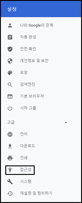설정에 들어가면 하나의 설정탭으로 이동하게 되며, 좌측에 아래와 같은 탭이 생성되게 되는데, 여기서 처음에 말한 접근성을 클릭해주면 된다. (접근성은 고급 항목에 있어 안 보일 수도 있는데 고급탭을 클릭해주면, 나타나게 된다.)