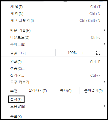 우선 우측 크롬브라우저 우측 상단에 위의 이미지처럼 점이 3개 수직으로 붙어 있는 아이콘이 보일 것이다. 해당 아이콘을 클릭해 주면 아래와 같은 목록이 나타나게 되고 그중 설정을 클릭해주면 된다.