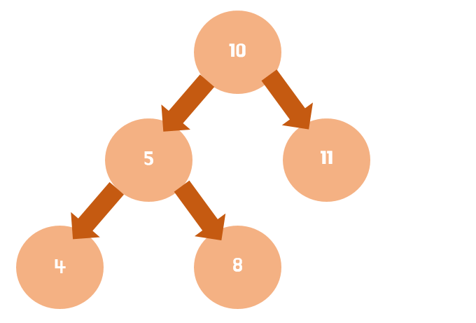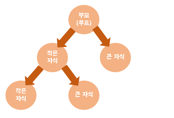 맨 위의 시작 노드를 보통 루트(root)라고 불리며, 나머지는 n개의 자식 노드들로 구성되어 있다. (하위 노드 위에 루트 노드를 제외한 인접한 상위 노드가 있다면 그 상위 노드를 부모 노드라고 부르기도 한다.) 해당 구조를 자세히 보면 같은 자식이라도 왼쪽은 작은 자식 오른쪽은 큰 자식이라고 된 것을 볼 수 있는데, 이는 마찬가지로 아래 이진트리를 보면 이해가 쉬울 것이다.