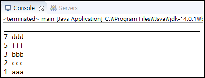 NavigableMap로 감싸준 TreeMap을 하나씩 출력해주기 위해서 entrySet으로 묶은 후 for문으로 하나씩 뽑아 출력해 보았다. 콘솔에 보이듯이 정상적으로 내림차순 정렬이 된 것을 확인할 수 있다.
