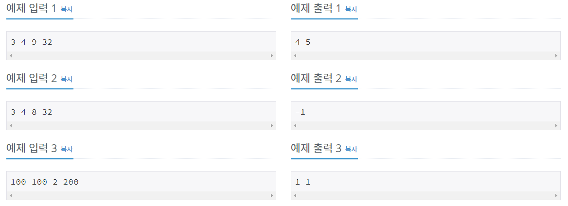 출력은 표준출력을 사용한다. 첫 번째 줄에 양의 수와 염소의 수를 각각 출력한다. 만약 가능한 해가 두 개 이상 있는 경우 혹은 가능한 해가 없을 경우, -1 을 출력한다.