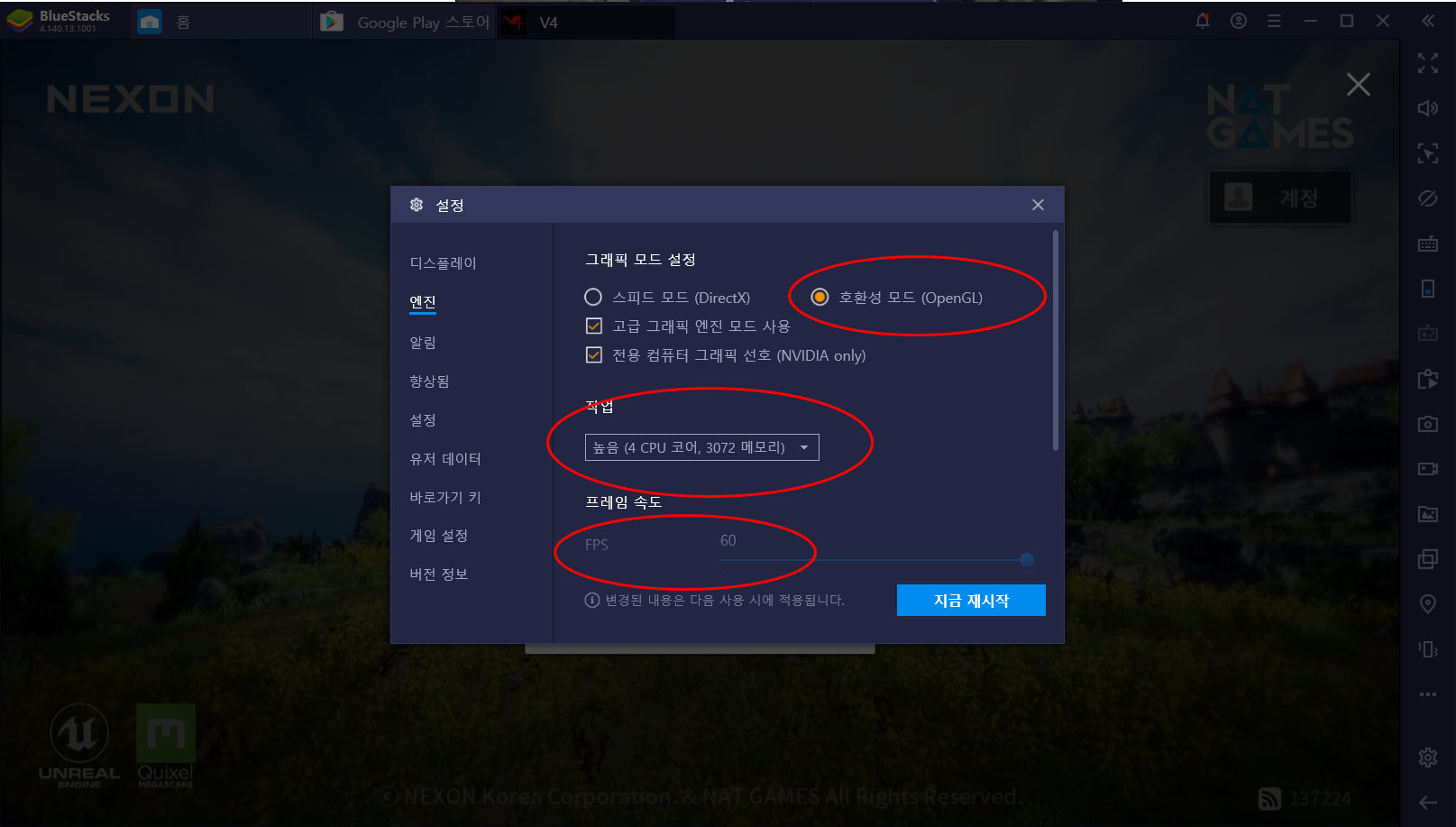 엔진 설정으로 가셔서 그래픽 모드 설정에 호환성 모드를 설정을 합니다.
