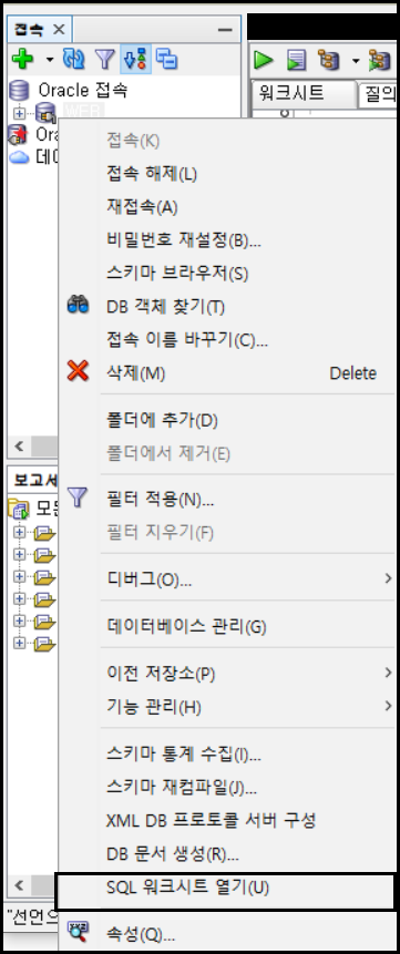 기존에 사용하던 데이터베이스를 우클릭 하면 위와 같은 창이 나타나게 되는데, 여기서 네모칸으로 표시된 SQL 워크시트 열기를 클릭하면 동일 데이터베이스 내에 다수의 워크시트를 사용할 수 있다.