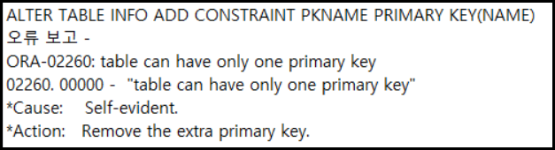 오류구문을 확인해보면 기존의 기본키가 제거되지 않아 새로운 기본키를 추가할 수 없다는 내용이다. 때문에 기본키를 변경하기 위해서는 반드시 DROP을 이용해 기존의 기본키를 삭제하는 작업이 필요하다.