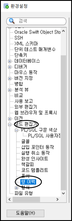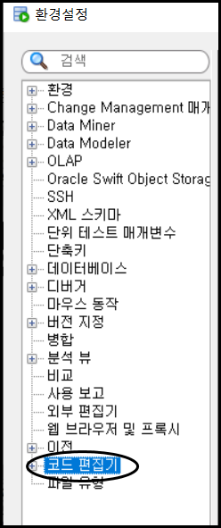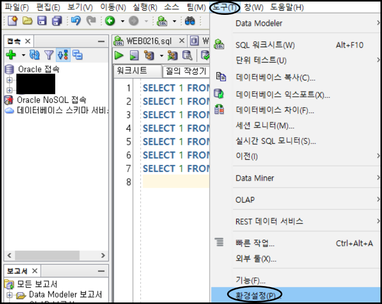 SQL Developer의 상단에 보면 도구라는 항목이 있으며, 그 내부의 환경설정에 들어가면 된다. 그러면 아래와 같은 창이 하나 뜨게 된다.