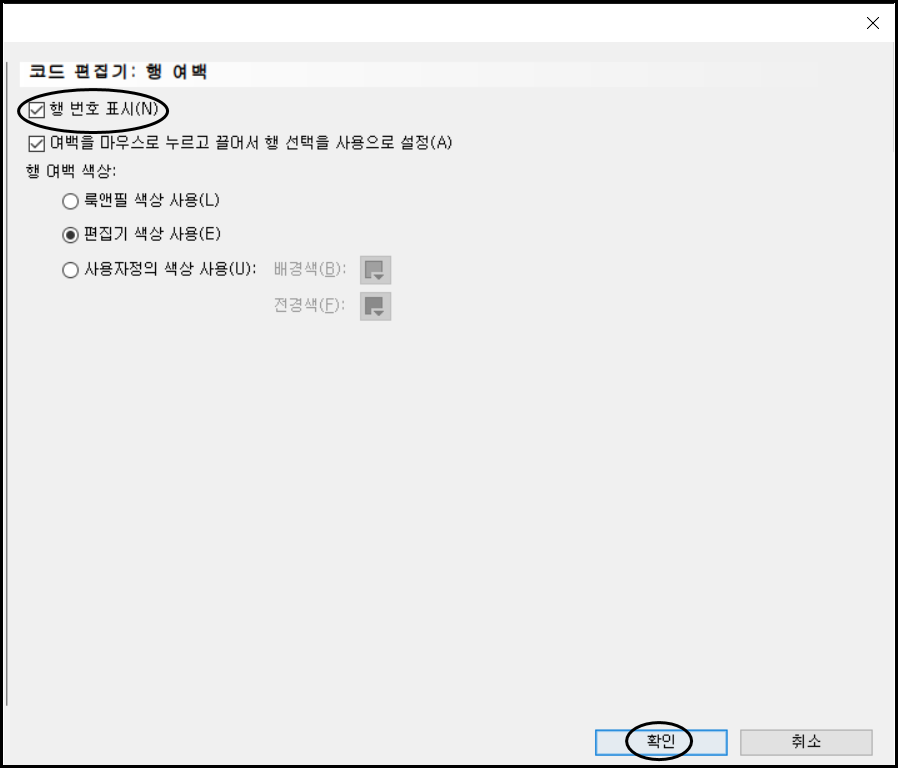 펼쳐진 추가적인 항목 중 행 여백을 누르면 아래와 같은 설정창이 오른쪽에 표시되는데, 여기서 행 번호 표시에 체크하고 확인을 누르면 항상 행 번호가 표시되도록 설정할 수 있다.