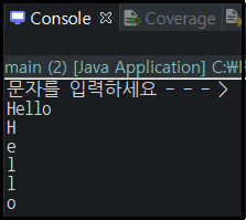 (Hello를 입력받아 각각 하나의 char형 데이터 ( H, e, l, l, o)로 분해되어 출력되는 것을 알 수 있다.)