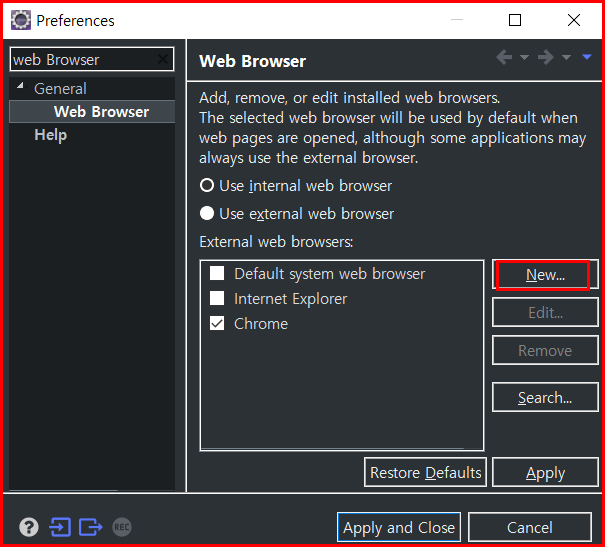 만약에 자신이 원하는 브라우저가 기본 External web browsers에 없다면 New 버튼으로 새롭게 추가해주어야 한다.