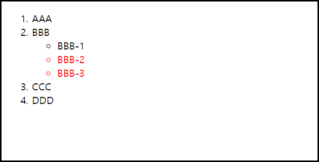 이번에는 BBB의 자손인 BBB-1의 모든 형제들을 찾아보도록 하자. BBB-1에 id를 b1으로 부여하고 이후 b1과 형제관계에 있는 li 태그들을 모두 찾는 것이다. 결과를 확인해보면 인접한 태그 BBB-2 뿐 아니라 인접하지 않은 BBB-3까지 선택됨으로써 모든 형제들이 지정된 것을 확인할 수 있다.