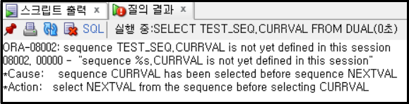 다만 여기서 주의할점은 시퀀스 생성 후 최초 [ 시퀀스명.CURRVAL ] 쿼리문을 사용할 경우 아래와 같은 에러가 발생한다.