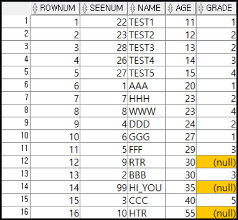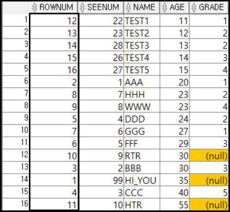 먼저 FROM 절에서 SEE_INFO TABLE을 나이순으로 정렬시킨 뒤 그 이후 값에 ROWNUM을 붙여주는 것이다, 결과를 확인해보면 나이순으로 정렬됨과 동시에 ROWNUM도 나이에 따라 순서대로 부여된 것을 확인할 수 있다.