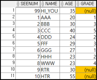 예제는 SEE_INFO라는 이름을 가진 테이블을 사용할 것이며, 테이블 내부의 데이터는 아래와 같다.