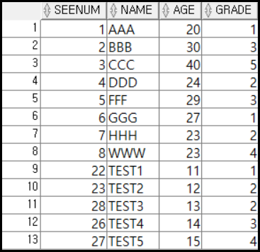 아래는 SENUM을 기본키로 가지는 SEE_INFO 테이블이다. 아래의 테이블을 기준으로 GROUPING을 진행해 보겠다.