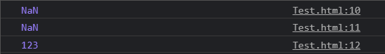 위의 코드의 결과는 아래와 같이 출력된다. 문자열 자체를 가지고 parseInt를 사용하면 이는 숫자로 변경할 수 없는 타입이기 때문에 NaN으로 출력되고 '123 hello'처럼 숫자가 포함된 문자열에 paseInt를 사용하면 문자열은 제거되고 숫자만 남아 출력된다.