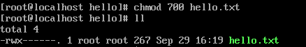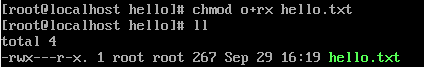 우선 위는 예제로 사용할 hello.txt의 정보이다. 권한을 확인하는 방법은 "ls -l"과 같은 명령어를 사용해서 해당 파일의 정보를 화면에 출력하면 된다.