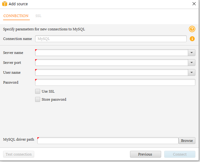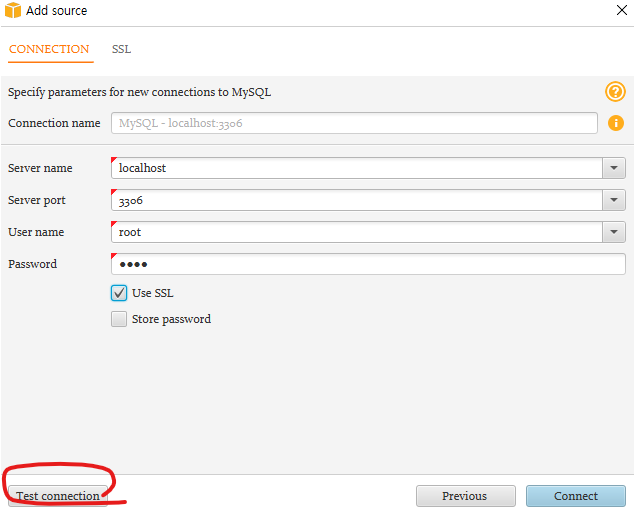 connection name은 자유롭게 설정하면 되며, 기존 자신이 사용하고 있는 DB의 접속 정보를 순서대로 입력한 후