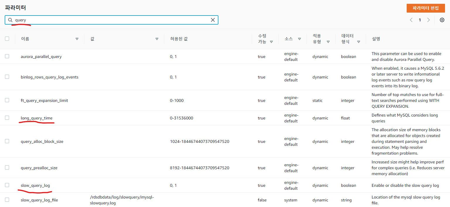 그 후 검색창에 "query" 라고 검색하면 slow_query_log / long_query_time 두가지 옵션이 보일 것이다.