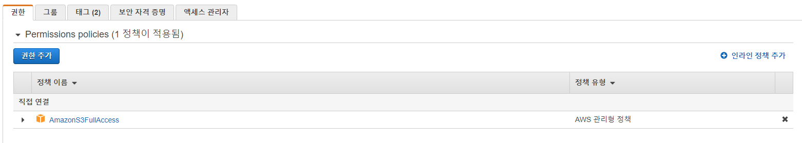 우선적으로 IAM의 계정 권한 중 AmazonS3 FullAccess 권한이 필요하다. S3 이외의 다른 명령어 사용 시 추가적인 권한이 필요할 수도 있으나 S3 접속만 할 거니 다른 권한은 따로 주지 않았다.