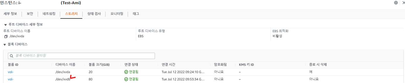 연결이 완료되면 아래와 같이 기존 인스턴스 디바이스 이름이 변경된 것을 확인할 수 있다.