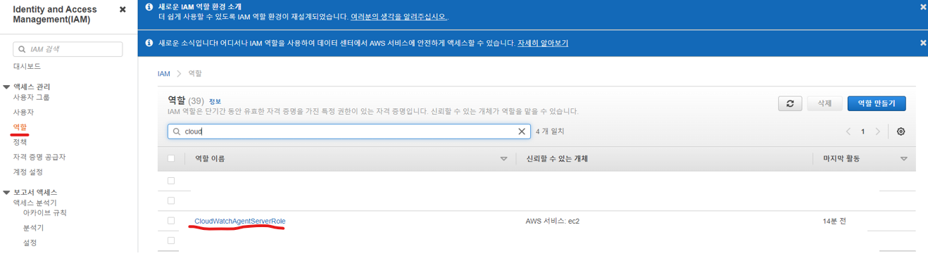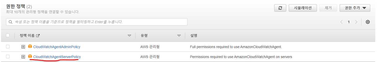 서버와 cloudwatch 간에 통신을 하기 위해서는 ec2에 권한을 부여해 주어야 한다. aws IAM에서 아래와 같은 역할을 만들어준다. (정책명: CloudWatchAgentServerRole)