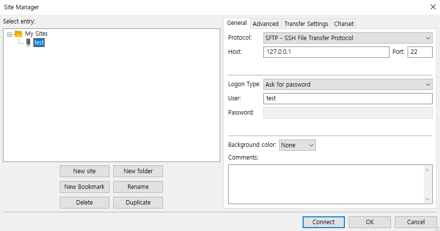이후 ifconfig 명령어로 자신의 사설 아이피 정보를 확인한 후 파일 질라 커넥션 정보에 입력해주면 접속이 잘된다. 아래는 파일질라 접속 정보 세팅이니 참고하면 된다.