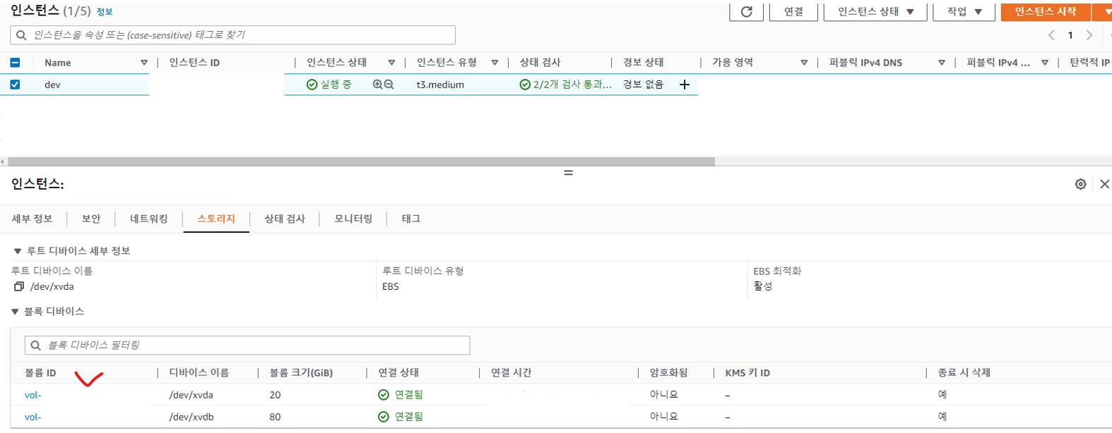 EC2 스토리지의 루트 볼륨 정보를 확인한다.상단에 있는 볼륨디바이스가 root이니 클릭해서 콘솔 화면을 이동한다.
